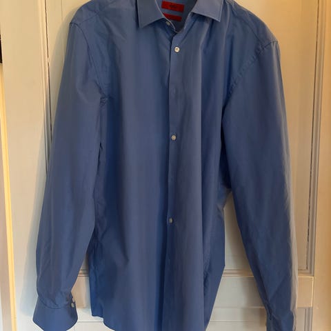 Hugo Boss Hugo skjorte for herre i størrelse M. Skjorten er blå med diskret stripemønster og har slim fit-passform. Materialet er bomull, og den er merket som easy iron. Klassisk krage, lange ermer og knappelukking foran. Egner seg til både hverdags- og penbruk.