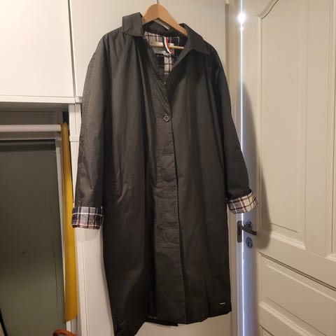 Klassisk dobbeltspent modell med knapper foran og beltedetaljer på ermene.