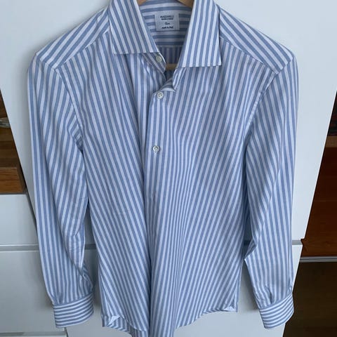 Slim, lyseblå og hvit skjorte fra Mazzarelli, str 15 1/2 - 39. I 30% lin og 70% bomull. Som ny!