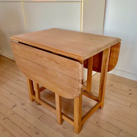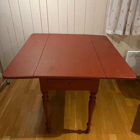 Flott eldre klaffebord med skuff. Hvitmalt understell. Stødig og fint bord. Begge lemmer holdes godt oppe, men den ene «pinnen» mangler for optimal støtte. Sikker ikke vanskelig å lage ny evt. Høyde 75 cm, dybde 70 cm, lengde med begge lemmer oppe 127 cm og uten lemmer slått opp 80 cm. Må hentes.