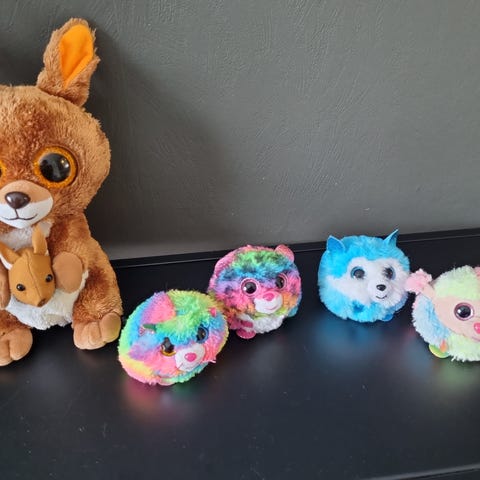 Ty kosedyr sett. Flere ulike myke kosedyr i forskjellige dyrefigurer og farger. Passer som lekekosedyr eller pyntegjenstander på barnerom. Laget i mykt plysjmateriale med karakteristiske store øyne på figurene.