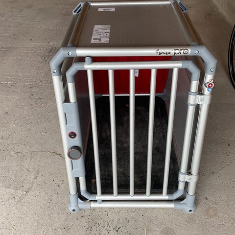 4Pets Pro 4 Small hundebur i metall for bruk i bil eller innendørs. Buret har ytre mål ca. 66 x 81,5 x 73,5 cm. Konstruksjonen er i grå aluminiumsramme med gitterdør foran og skrå bakside tilpasset bagasjerom i bil. Innvendig er det mørk bunnplate og røde sidevegger. Døren har låsemekanisme i siden. Egnet for hunder innenfor burets mål og høyde.