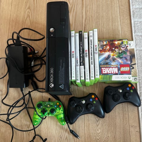 Microsoft Xbox 360 Elite spillkonsoll med Kinect-sensor, håndkontroll, strømforsyning og diverse kabler. Det følger også med flere Xbox 360-spill i originalcover. Men er noe gale med rommet der du setter inn spillet- det vil ikke åpnes, men vil tro at det er noe som kan fikses
