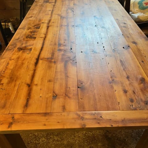 Godt bruke spisestue bord med stoler. Følger med to ileggsolater til bordet som gjør det lengre. Bordet har synlige merker på platen. Stolene har synlige bruksmerker. Den ene er limt i krysset på ryggen.