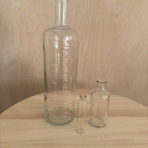 Flasken: Selve glassflasken er av en type som ble masseprodusert sent på 1800-tallet eller tidlig på 1900-tallet. Den ble brukt til alt fra medisin og kjemikalier til brennevin. Den har en enkel, støpt form med en karakteristisk "ring" rundt åpningen.