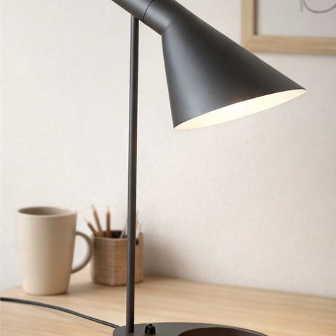 Louis Poulsen Arne Jacobsen bordlampe i grå utførelse med messingfarget stamme og detaljer. Lampen har en konisk skjerm som gir nedadrettet lys, egnet som arbeids- eller leselys på skrivebord, nattbord eller sidebord. Designet er funksjonelt og enkelt, med integrert bryter plassert på lampefoten for enkel betjening.