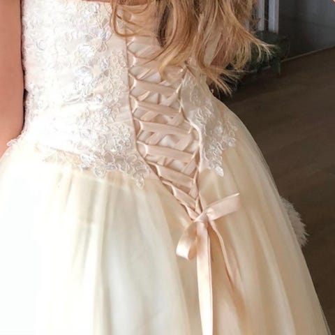 Kjolen har stroppeløst, hjerteformet liv med dekorative blonder og paljettdetaljer foran. Skjørtet er langt og voluminøst i flere lag tyll. Baksiden har snøring som gjør det mulig å justere passformen.