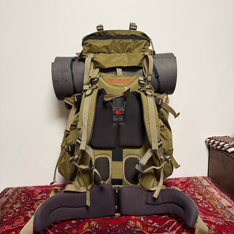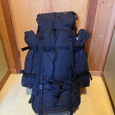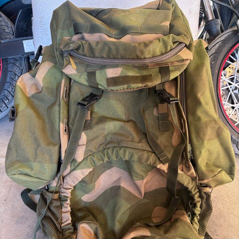 Dovre 120 ca 2008 modell. Svært lite brukt, ca 10 turer. Meget god sekk som sitter svært godt på og som man kan bære skikkelig tung bør på lange turer. Har samme bæremeis som Norrøna Para ranger, men har til forskjell avtagbare sidelommer (praktisk for sideturer fra camp) og vanntett innerpose/viltpose - ps aldri brukt til kjøtt! Gode festemuligheter slik at man kan ha både telt, liggeunderlag, sovepose og fiskestenger utpå sekken. Så har man fremdeles 120l til rådighet.