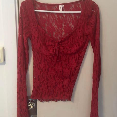Pieces blondetopp for dame i størrelse M. Toppen er rød og laget i nylon med gjennomsiktig blondestruktur og blomstermønster. Langermet modell som passer til bruk alene eller over annet tøy, for eksempel singlet eller topp, ved ulike anledninger.