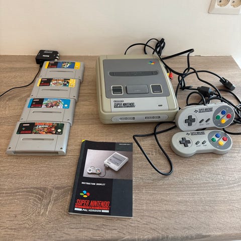 Nintendo Super Nintendo spillkonsoll med kablet håndkontroller. Klassisk stasjonær konsoll for TV-tilkobling, egnet for én eller flere spillere avhengig av antall kontroller som kobles til. Konsollen bruker originale Super Nintendo-spillkassetter og har tilkobling for strøm, videoutgang til TV og kontrollerporter på fronten. Håndkontrolleren har retningsknapper, funksjonsknapper og skulderknapper tilpasset Super Nintendo-spill.