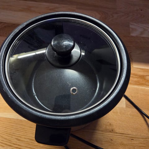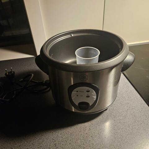 Riskokeren har en ytre beholder i metall og en innvendig kjele med non-stick belegg (som er godt brukt). Frontpanelet har bryter for tilberedning og funksjon for å holde risen varm (Warm/Cook). Lokket er i glass med håndtak på toppen, slik at man kan følge med på tilberedningen.