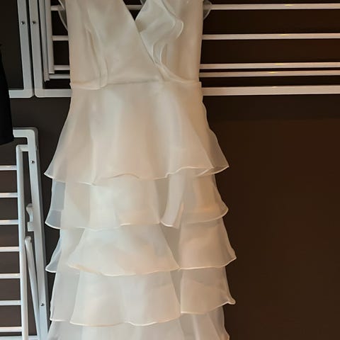 Brukt bare en kveld ,nydelig silke-sateng ,lang kjole med splitt foran . Selges for 1200 kr.