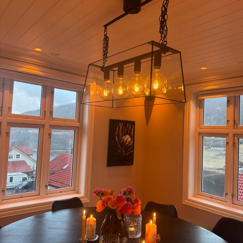Nypris for tilsvarende lamper er ca. kr. 3600-4600. Minner om Dovre taklampe m 3 pærer som koster kr. 4599. Ekstra lengde sort kjetting til oppheng kan medfølge. Lyspærer medfølger ikke.