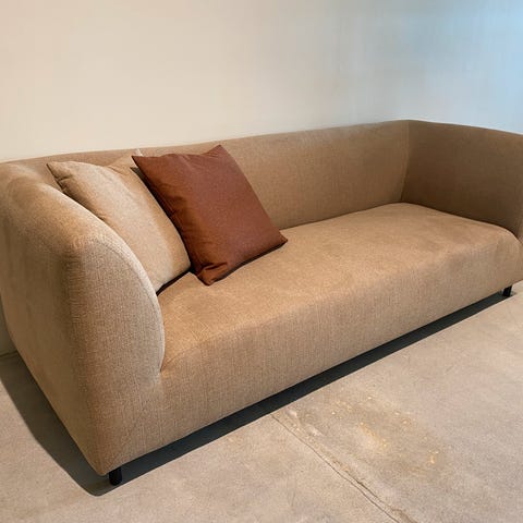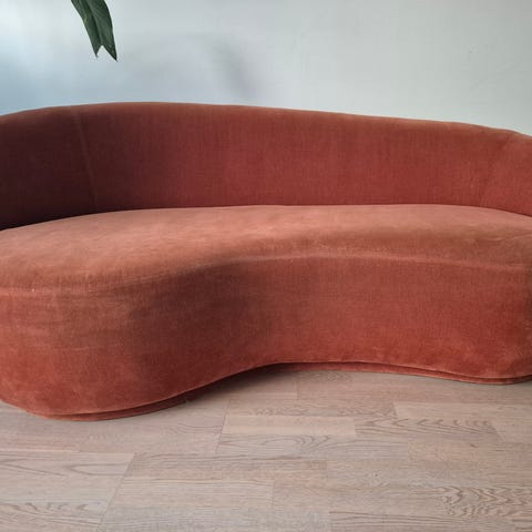 Sofa med buet design i oransje stoff. Sofaen har hel sittepute og lav rygg med avrundede armlener som går i ett med ryggen. Fargen er en klar oransje tone, og sofaen står på en diskret base mot gulvet.