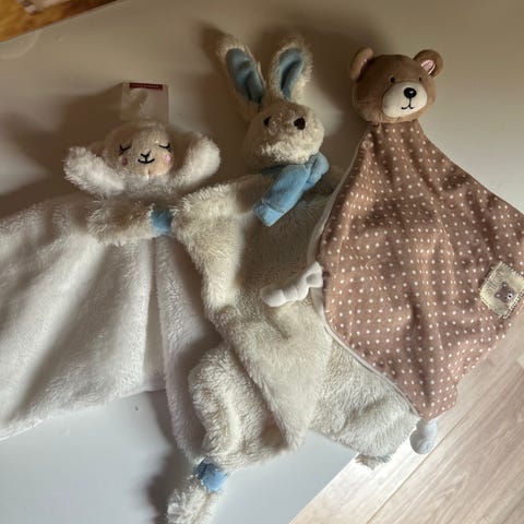 Koseklut med sau fra Princess. Snipp/Snapp fra Disney. Kanin fra Tinka. Helt nye og ubrukte, kun vasket. Selges for 50 per stk.