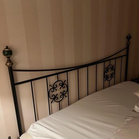 IKEA seng med metallramme i svart farge. Sengen har dekorativ gavl med buer og svingende mønster. Liggeflaten består av to separate madrasser. Passer som dobbeltseng i soverom. Lengde 210 cm og bredde 165 cm. Må hentes i Kvernavika.