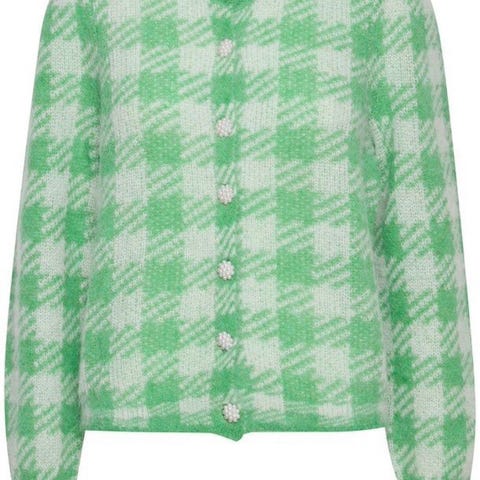 Grønn fin cardigan fra ICHI str M, men stor I str syns jeg . Inneholder 52% akryl, 30% resirkulert polyester, 15% alpakka og 3% Elastan