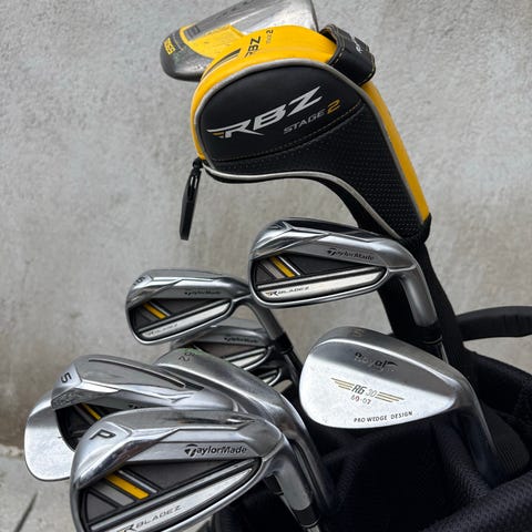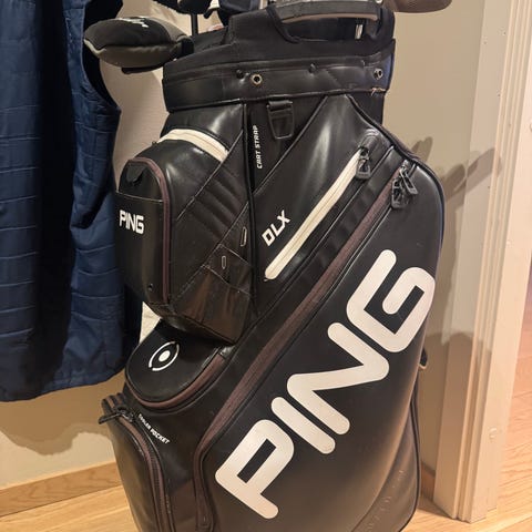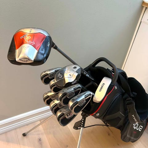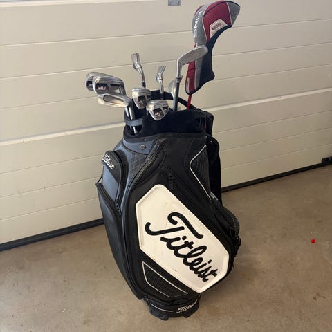 Links Calleway Rouge jernsett med wedge 52/56/60 grader. Tour bag, samt eldre Odyssey two ball putter tilsalgs