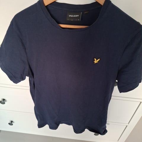 Lyle & Scott t-skjorte for herre i størrelse S. T-skjorten er svart og laget av bomull. Klassisk rund hals og kort erm. Diskré Lyle & Scott-logo på brystet. Passer til hverdagsbruk alene eller under genser eller jakke. Har brukt den 2 ganger den passer meg ikke oppen for bud.