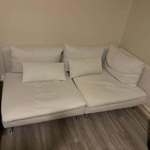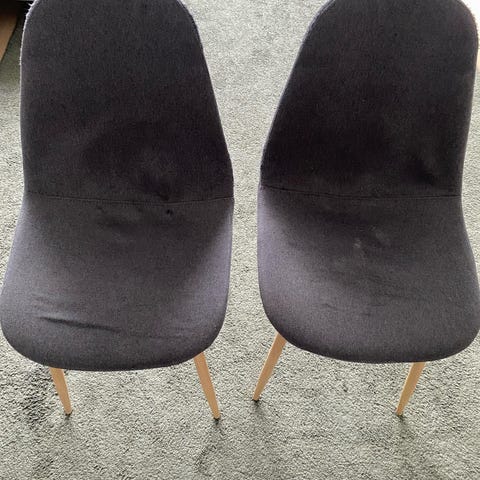 Stolene er brukt og har normale bruksspor, men er stabile og fungerer helt fint. Trekkene kan tas av og vaskes.
