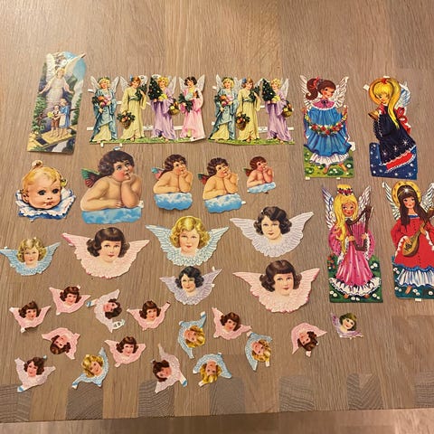 Ark med klistermerker med englemotiv i ulike størrelser og fasonger. Motivene viser både englebarn og voksne engler. Selges til høystbydende. Kan ta ut de du ønsker å kjøpe. Sendes i konvolutt.