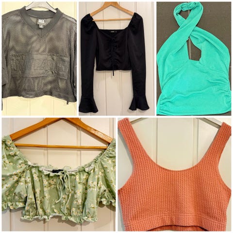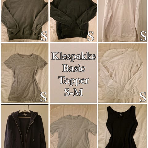 Fine topper i størrelse M som jeg ikke bruker/aldri har brukt, som jeg nå må kvitte meg med. To av toppene er S, men den grønne passer en M, og den svarte har snøring bak, så den er justerbar.