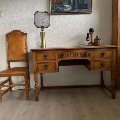 Skrivepult rolltop i tre i brun utførelse. Pulten har nedtrekkbar rolltop-lukking, flere små skuffer og hyller i overdel, samt uttrekkbar skriveflate med grønn skriveplate. Under skriveflaten er det en bred skuff og et skap med dører for ekstra oppbevaring. Klassisk utforming med profilert kant og dekorert topp, egnet som arbeidsplass eller oppbevaringsmøbel i stue, kontor eller arbeidsrom.