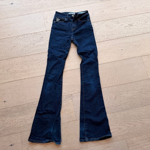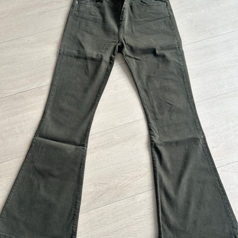 Klassisk femlommersmodell med glidelås og knapp i front. Modellen er høy på livet og bootcut/ litt sleng i bena.