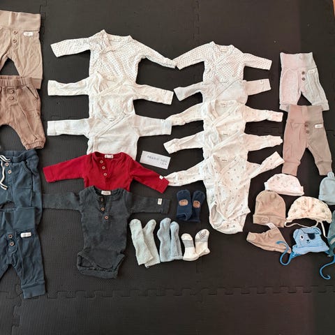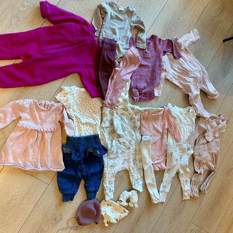 Ein liten flekk på kvar av dei blomstrete body i str 68, to små flekkar på ulldressen frå devold. Elles er det ingen hol som eg har sett. Er generelt i veldig god stand!