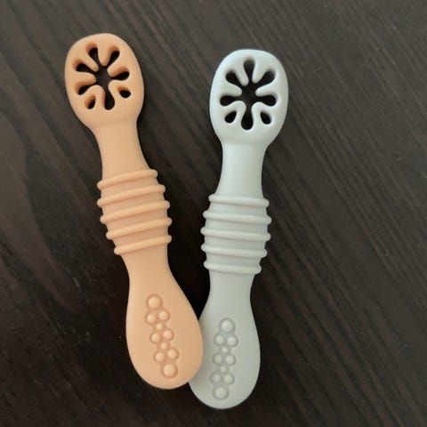 Liewood babyskjeer og My1ofNorway babyskjeer i flere farger. Settet består av små skjeer med strukturert håndtak og myk skjeedel. Egner seg til mating av baby og som prøve å spise selv skjeer