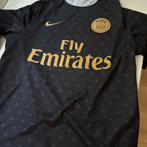 Nike PSG fotballtrøye for unisex i størrelse M. Trøyen er hovedsakelig svart med rosa detaljer og klubbemblem på brystet. Egnet til fotball og annen fysisk aktivitet, eller som supporterplagg til hverdagsbruk.