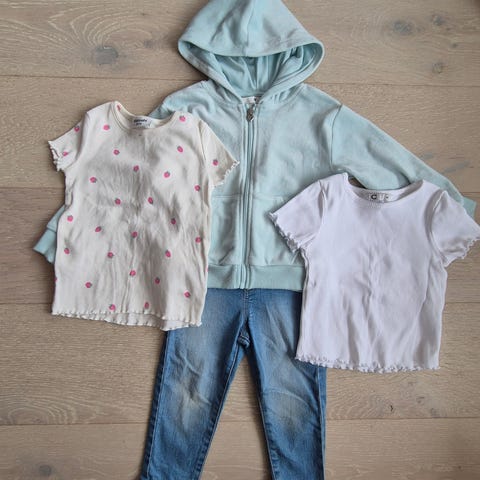 Fin liten pakke med cardigan med zip, 2 t-skjorter og jeans. Pent brukt.