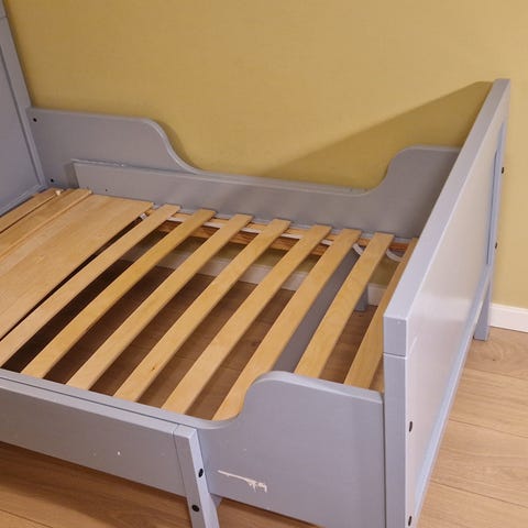 IKEA uttrekkbar barneseng i hvit utførelse. Kjøpt ny og brukt av ett barn. Sengen kan justeres i lengden etter barnets høyde, fra kortere småbarnslengde til full lengde for større barn. Den har høye sidepaneler som fungerer som sengehest, samt sengebunn med lameller i tre. Passer til madrass som kan forlenges i flere trinn (madrass kan følge med). Selges demontert. Må hentes.