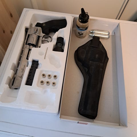 Meget pen og velfungerende Co2 revolver, denne bruker vanlege luftgever skudd (ikkje runde stålkuler) riflet løp gir god pressisjon , kjempegodt avtrekk . Veldig autentisk våpen angående vekt og lading der en tar ut patronene og setter en pellet i kver patron , 2 gasspatroner og 500 skudd medfølger, hylster som kan festes i belte samt koffert medfølger