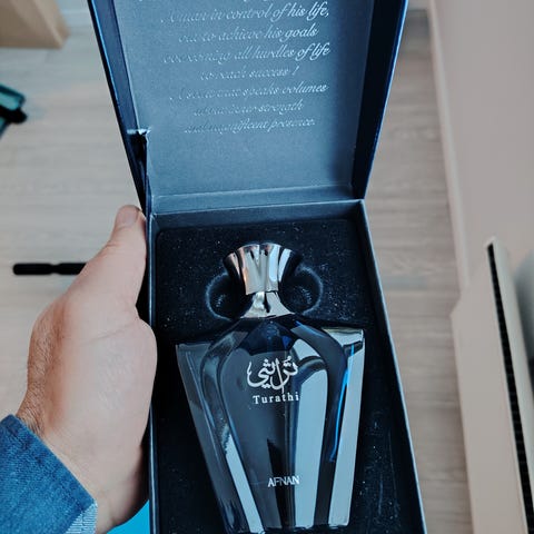 Afnan Turathi Blue Eau de Parfum 100 ml. Parfymen leveres i mørk blå flaske med sølvfarget kork og tilhørende eske. Dette er en konsentrert eau de parfum som passer til daglig bruk eller spesielle anledninger. Flaskestørrelsen er 100 ml, som gir god varighet ved normal bruk.