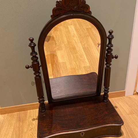 Sminkebord i empire stil med integrert speil i topplokket. Bordet har en bordplate som kan løftes opp, med speil på innsiden og inndelte rom for oppbevaring av sminke eller smykker. I tillegg har møbelet en skuff foran og en åpen hylle nederst mellom beina. Utførelse i mørkt treverk med dreide stolper foran. Egnet som sminkebord eller lite toalettbord på soverom eller i gang. Trolig fra 1930-tallet Må hentes på Skullerud. Bordet 75 cm høyt, 50 cm bredt og 35 cm dypt. Speilet måler 72 cm høyt og 43 cm bredt. Selges samlet eller hver for seg. 700 kroner for bordet og 500 kroner for speil. Må hentes på Skullerud.
