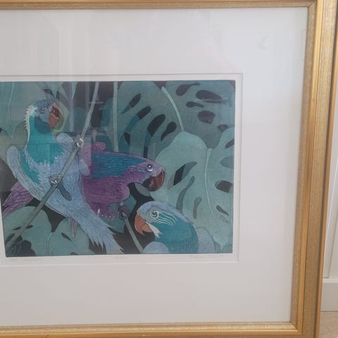 Bildet er håndmalt etter trykking med metalliske farger. Dvs det blir veldig levende og endrer seg avhengig av lys. Pris er med innramming som vist. Paspatour og rimelig treramme. Ikke kunstglass.