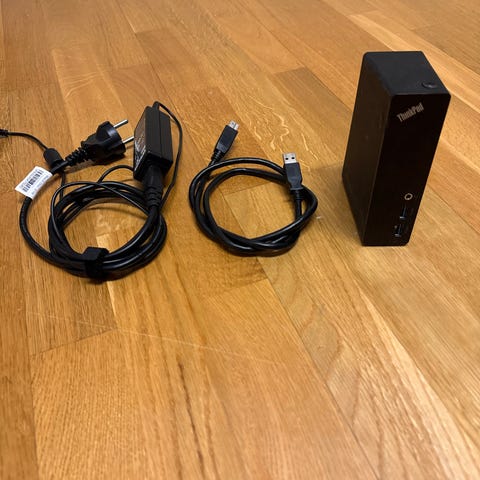 Leveres med strømforsyning og tilhørende kabler slik som vist på bildene. Egnet som dokkingstasjon for kompatible bærbare PC-er med USB-tilkobling.