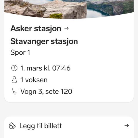 Go-Ahead togbillett for én voksen fra Stavanger stasjon til Oslo S. Avgang fra Stavanger stasjon kl. 06:32 med ankomst Oslo S kl. 14:25. Reisetid er 7 timer og 53 minutter. Billetten gjelder på tog med avgang fra spor 2 på Stavanger stasjon og ankomst på spor 12 på Oslo S.