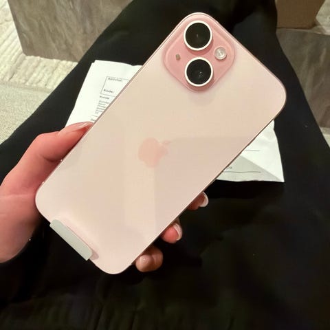 Apple iPhone 15 smarttelefon med 128 GB lagringsplass i rosa farge.