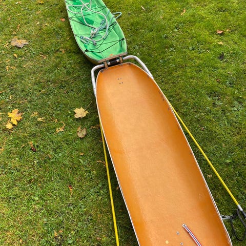Fjellpulken barnepulk i rød farge med svart overdel. Pulken har glassfiber- eller plastmeier, drag med festepunkter og polstret trekksele med ryggstøtte. Det følger med vindskjerm/bøyle foran. Pulken er egnet for transport av barn på ski- og vinterturer.