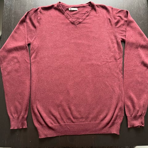 Lekker, burgunderrød kabelstrikket genser selges. Genseren er helt ny og har fortsatt merkelappen på.
