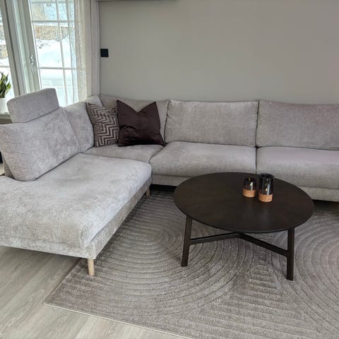 Grått velourstoff som er lett å vaske og holder fasongen på putene fin.