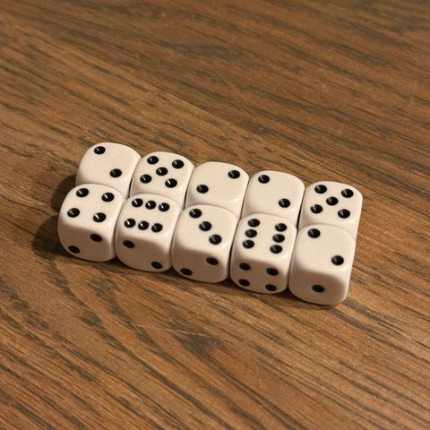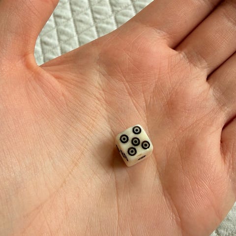 Gul terning med avrundede kanter og hvite prikker. Terningen har innebygd lys som lyser i ulike farger, når den er aktivert. Egnet som spilleterning eller som enkel lyseffekt i lek og spill. Eller fidget. Noe slitasje på den hvite skriften på terningen.