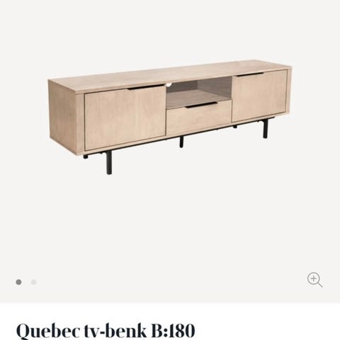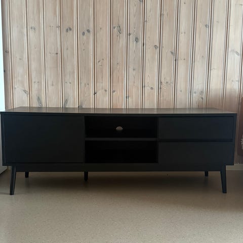 Bohus TV-benk i mørk trefinish. Benken har et moderne, rektangulært design med slanke ben. Den består av åpne hyller i midten som egner seg til elektronikk og medieutstyr, samt lukkede oppbevaringsrom på sidene med skuffer og dører. Overflaten har synlig trestruktur i en mørk tone, og bena er i matchende mørk farge. Passer som TV-møbel eller lav oppbevaringsbenk i stue eller mediarom.