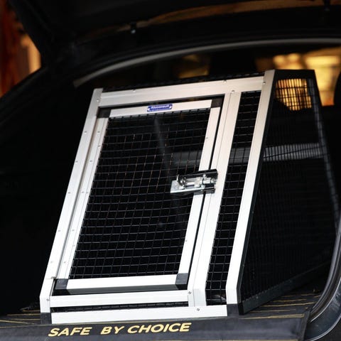 Hundebur for bil i aluminium med svarte gittervegger. Pent brukt hundebur fra Alukonsult tilpasset Tesla 3. Buret har to dører, en foran og en bak. Enkelt å montere i bagasjerommet. Madrass kan følge med.