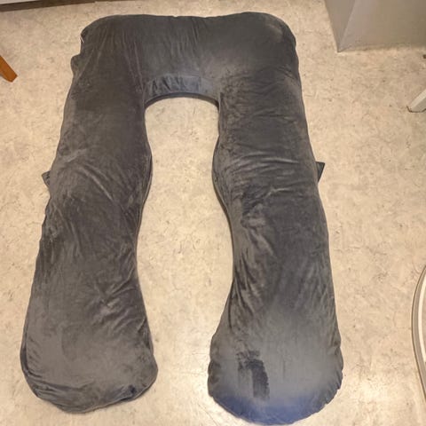 IKEA pute i U-fasong i grønn tekstil. Formen gir støtte rundt kropp og ben, og kan brukes som støttepute i seng eller sofa. Trekket har glatt overflate og puten er fylt med mykt materiale for komfortabel bruk.