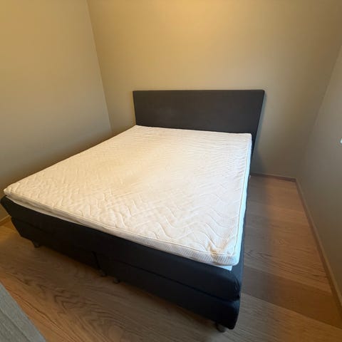 150x200 seng med mørkt grått stofftrekk. Består av to enkeltsenger med en tykk madrass over. Den er brukt i noen år, så har noen småmerker. Er likevel i fin stand og er brukt med overmadrass over. Det er mulig å ta av trekket og vaske i maskin. Sengen er mest sannsynlig fra IKEA, men finner ingen synlig lapp med merke. På grunn av salg av leiligheten gis denne bort