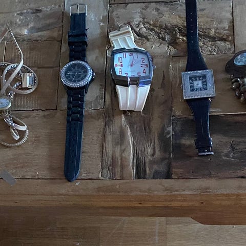 Kun en av klokkene går per nå, men regner med at de fleste bare trenger batteribytte da de aller fleste lar seg stille/justere. To av klokkene mangler krone/stamme. Et par av klokkene virker til å være ubrukte. Den med opptrekk trenger service. G-Shock klokka går, men den har løs krone som ikke responderer.