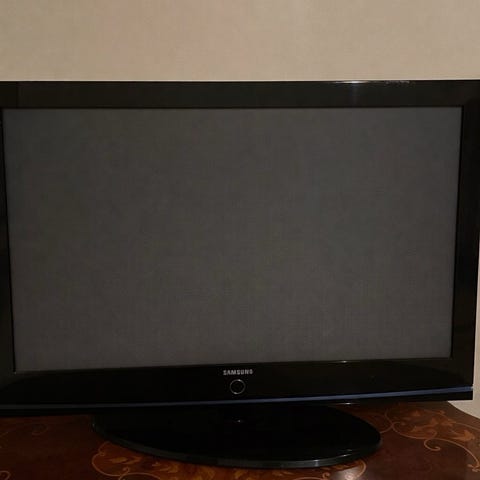 Samsung TV i svart farge. Modellen har bordstativ og leveres med fjernkontroll. På baksiden finnes flere tilkoblingsmuligheter, blant annet HDMI, komponent, SCART, VGA og lydtilkoblinger. TV-en kan brukes sammen med eksterne enheter som TV-dekoder, spillkonsoll eller mediespiller via de tilgjengelige inngangene.